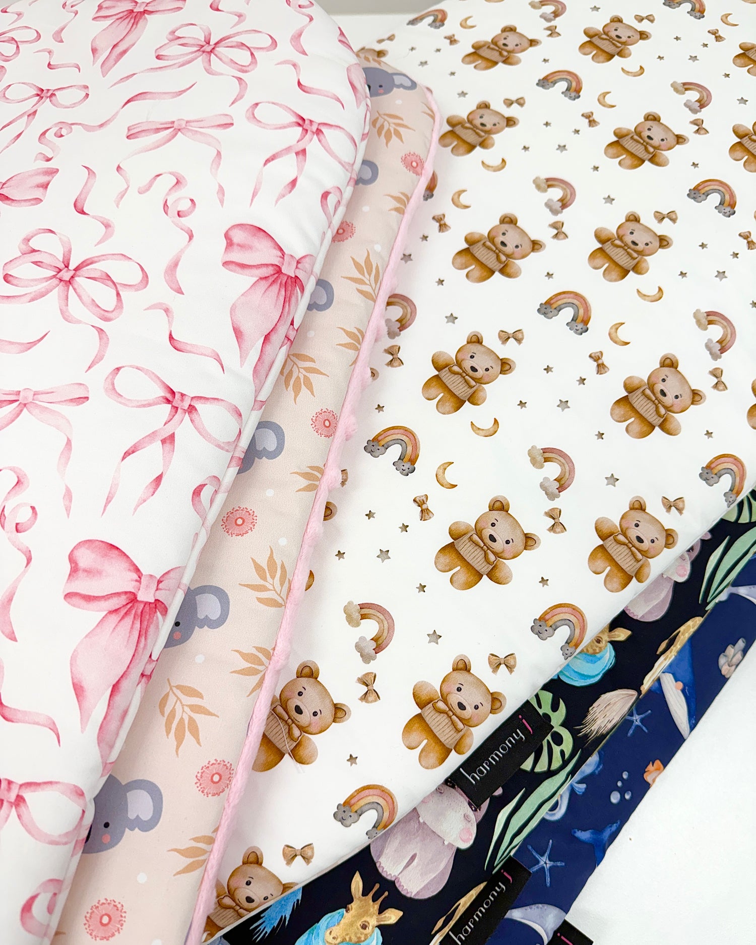 Bring comfort and style to every stroll with Harmony J’s custom-made pram liners, bassinet liners and matching accessories — each lovingly handmade in Australia from soft, breathable 100 % cotton. Complete your collection with our padded shopping trolley liners, designed for everyday outings with comfort and care.